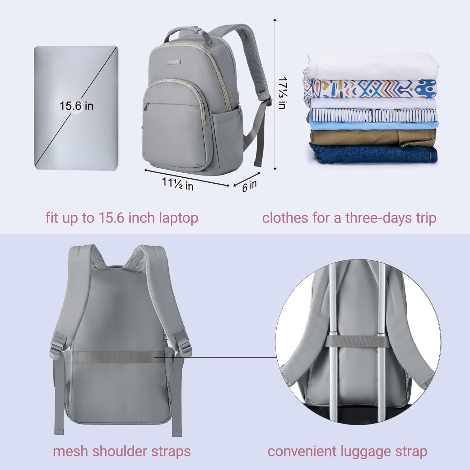 Enhanced Carrying Comfort : The work women laptop backpack with back U-shape three-dimensional ventilation design, comfortable wide breathable mesh shoulder straps with plentiful sponge pad help relieve the stress from your shoulder. Whether you are on the bus, subway, train, or plane. So the work laptop backpack is a gift idea for women