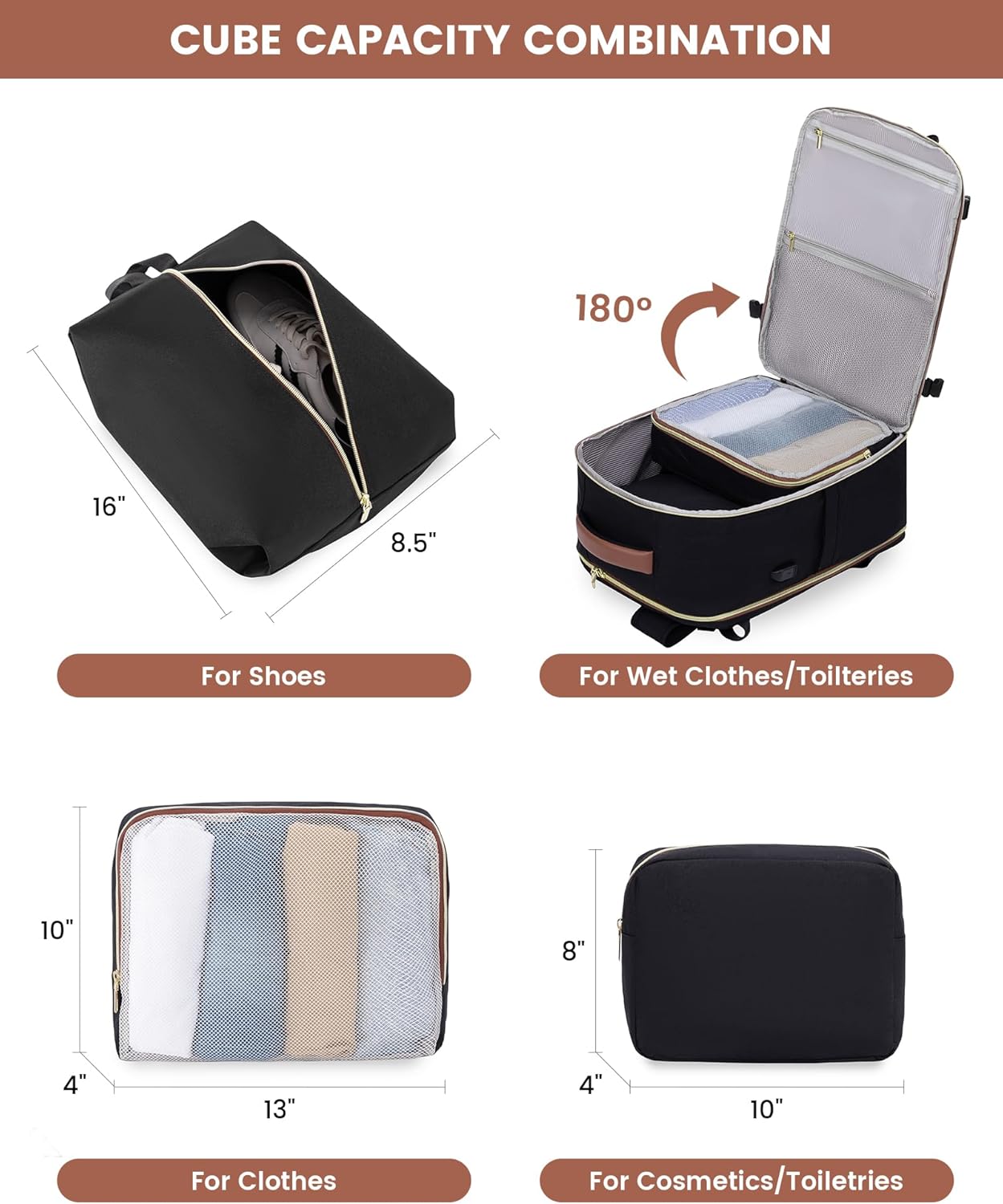 【3 Packing Cubes and Wet Pockets】Equipped with 3 extra packing cubes, including 2 storage bags and a shoe bag. A zippered wet compartment pocket can help you to separate dry items and wet items, and prevent any leaks or moisture from affecting your other items. If you have wet clothes or towel, just put it in this travel backpack.